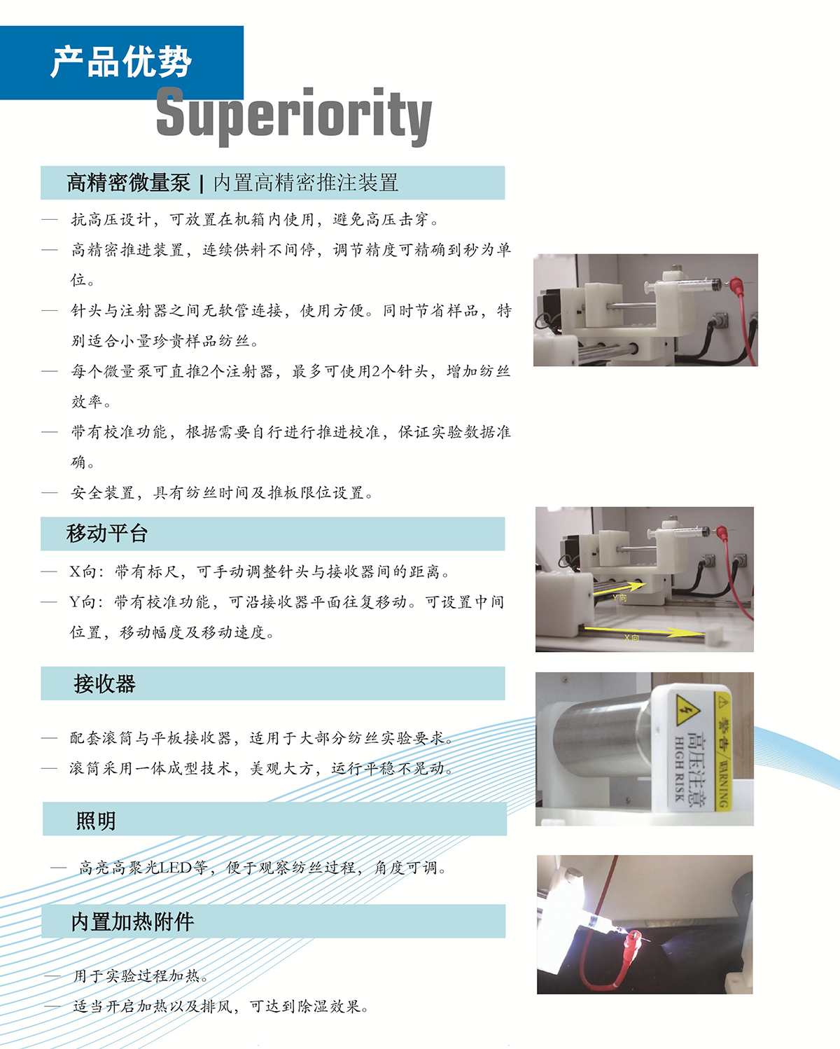 滚筒接收器一体成型,运行平稳不晃动 高亮高聚光LED灯,纺丝过程肉眼可见 多重安全保护,保障实验人员安全