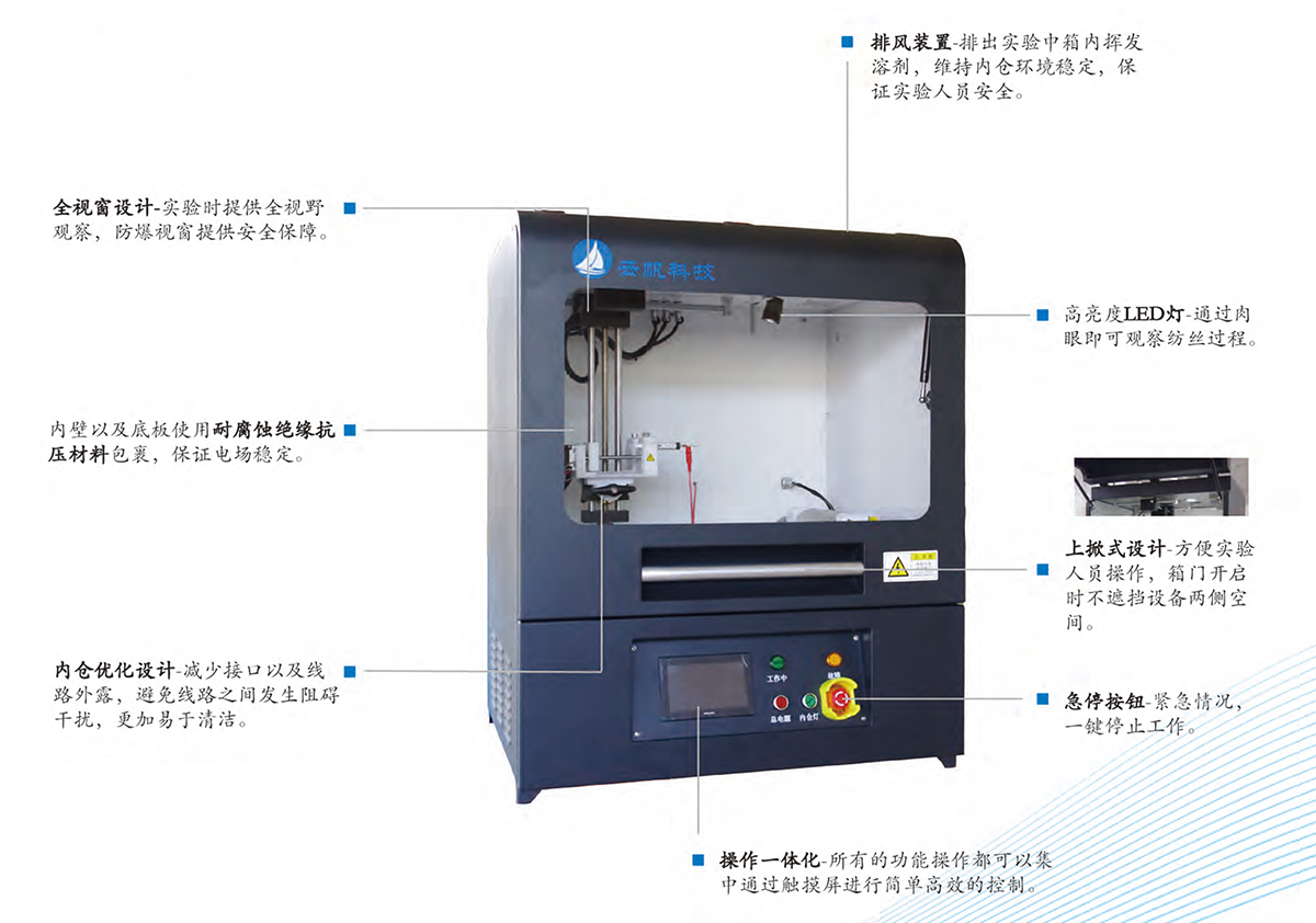 YFSP-T系列让纺丝实验变得简单 更专业的纺丝工具,YFSP-T系列是结合院校和科研机构需求而开发的经济型静电纺丝机,率先采用所有功能操作控制一体化集中设计。