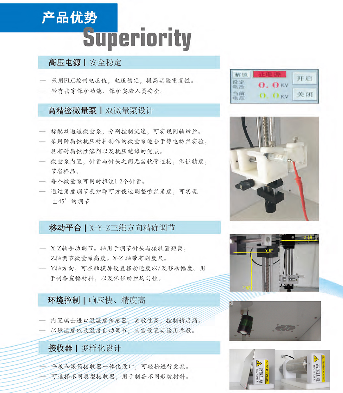 高性能的系统组件,以PLC作为核心控制系统结合仪器构造及功能细节,打造高性价比静电纺丝设备。所有的零配件采购都从用户体验出发,保证整体性能以及质量。 桌面设计,不占用过多空间 简单易用,无需说明即可操作 全视窗设计,便于观察 安全可靠,多重安全防护 稳固耐用,满足日常密集使用 PLC微电脑控制7寸真彩触摸屏,直接设置所有实验参数 双微量泵控制,可实现同轴纺丝 多种接收器可选,可制备不同形貌纤维 标配温湿度控制