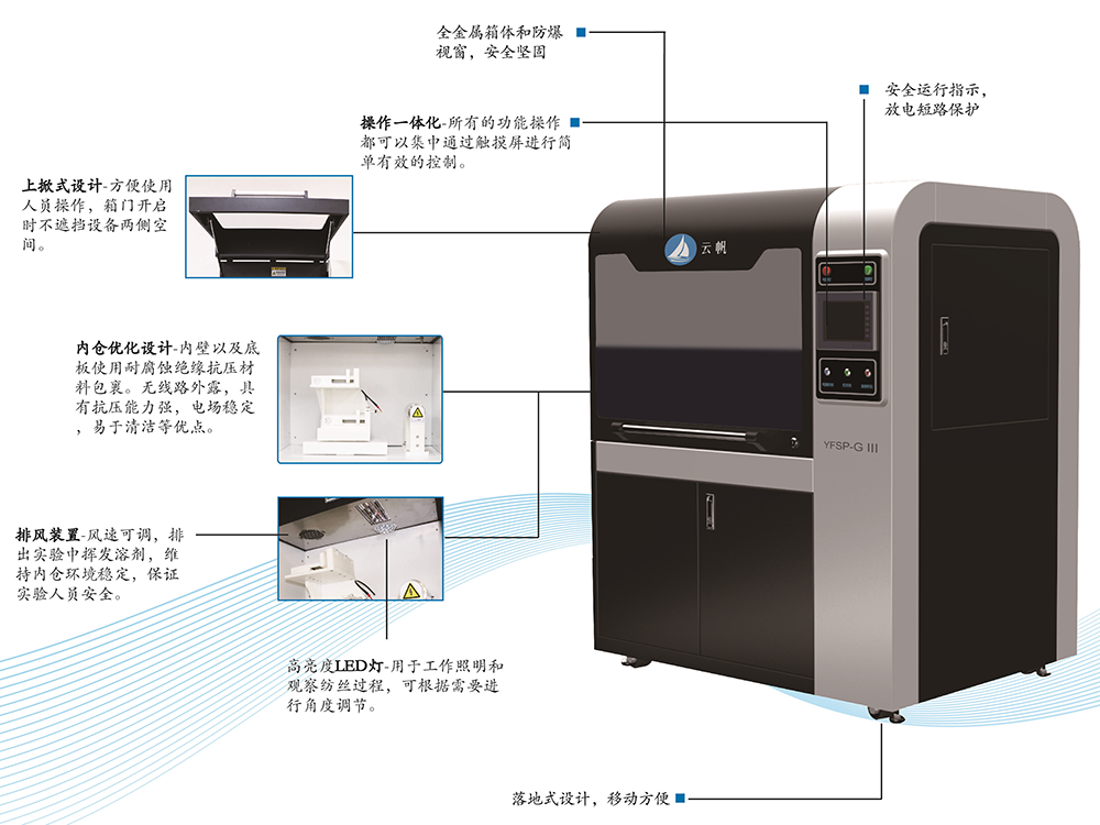 功能更全、更强大的静电纺丝机。定制系列是在桌面式经济系列静电纺丝机YFSP-T的基础上从设计以功能上做了全面的升级,并且预留大空间提供特殊化订制服务。