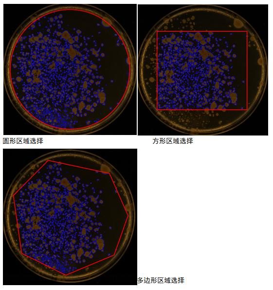 ColonyAnalyse软件可以实现圆形、方形和多边形统计区域选择功能,用户可以通过选择不同形状,统计需要的平皿区域。