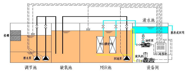 乡镇(农村)生活污水→格栅井→调节池→缺氧池→MBR→紫外消毒装置→清水池